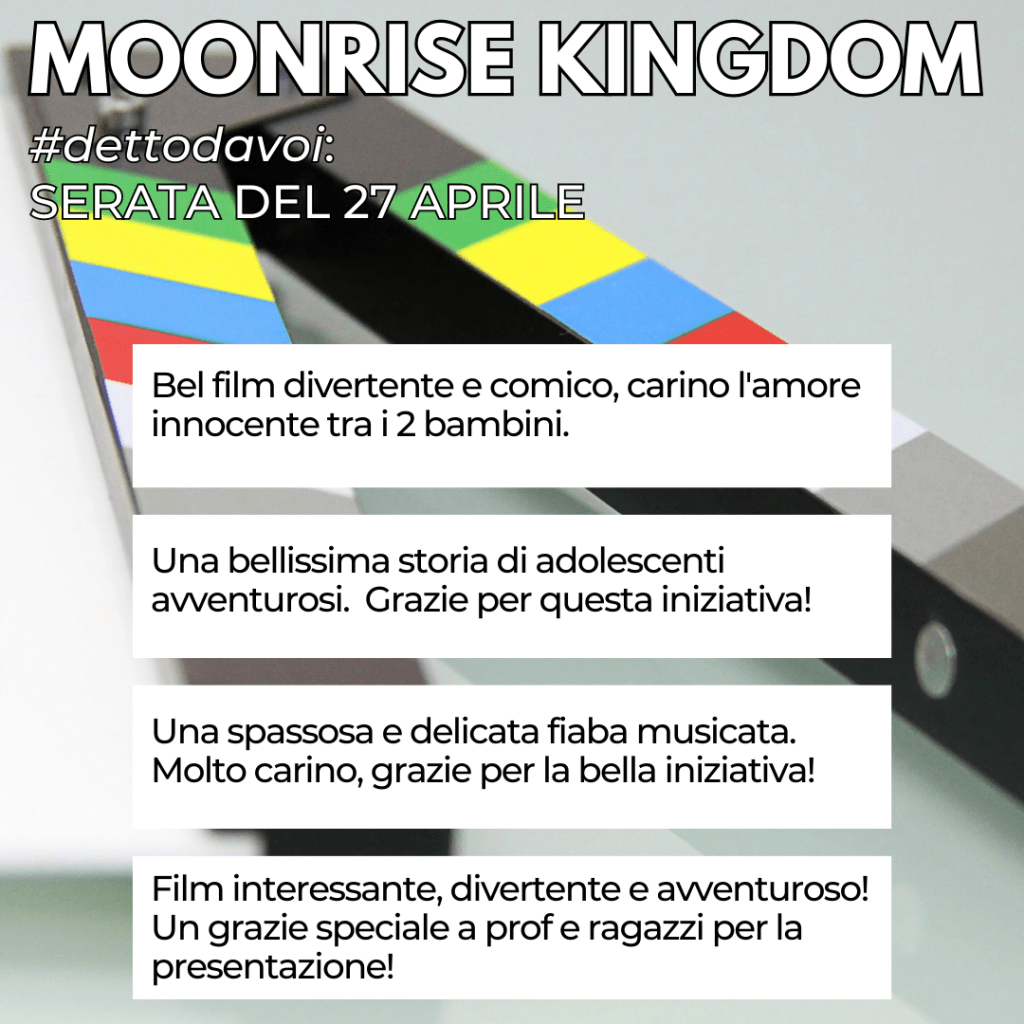 Ed ecco anche la carrellata di commenti relativa alla seconda serata di proiezione (27 aprile) del film Moonrise kingdom, preceduta dalla presentazione ad opera dei ragazzi e delle ragazze della 2C!