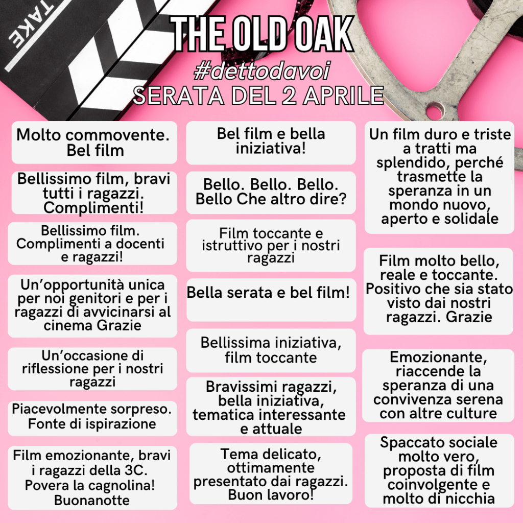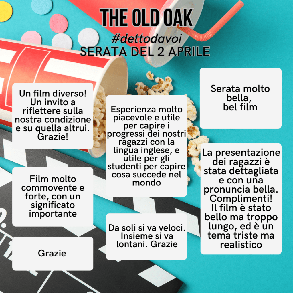 Ieri è toccato alla proiezione del filmThe Old Oak, preceduta da un’interessante presentazione ad opera delle classi 3C e 3F, che arrivati sul palco con tanto di bei cartelli inneggianti ad uno dei messaggi principali del film: