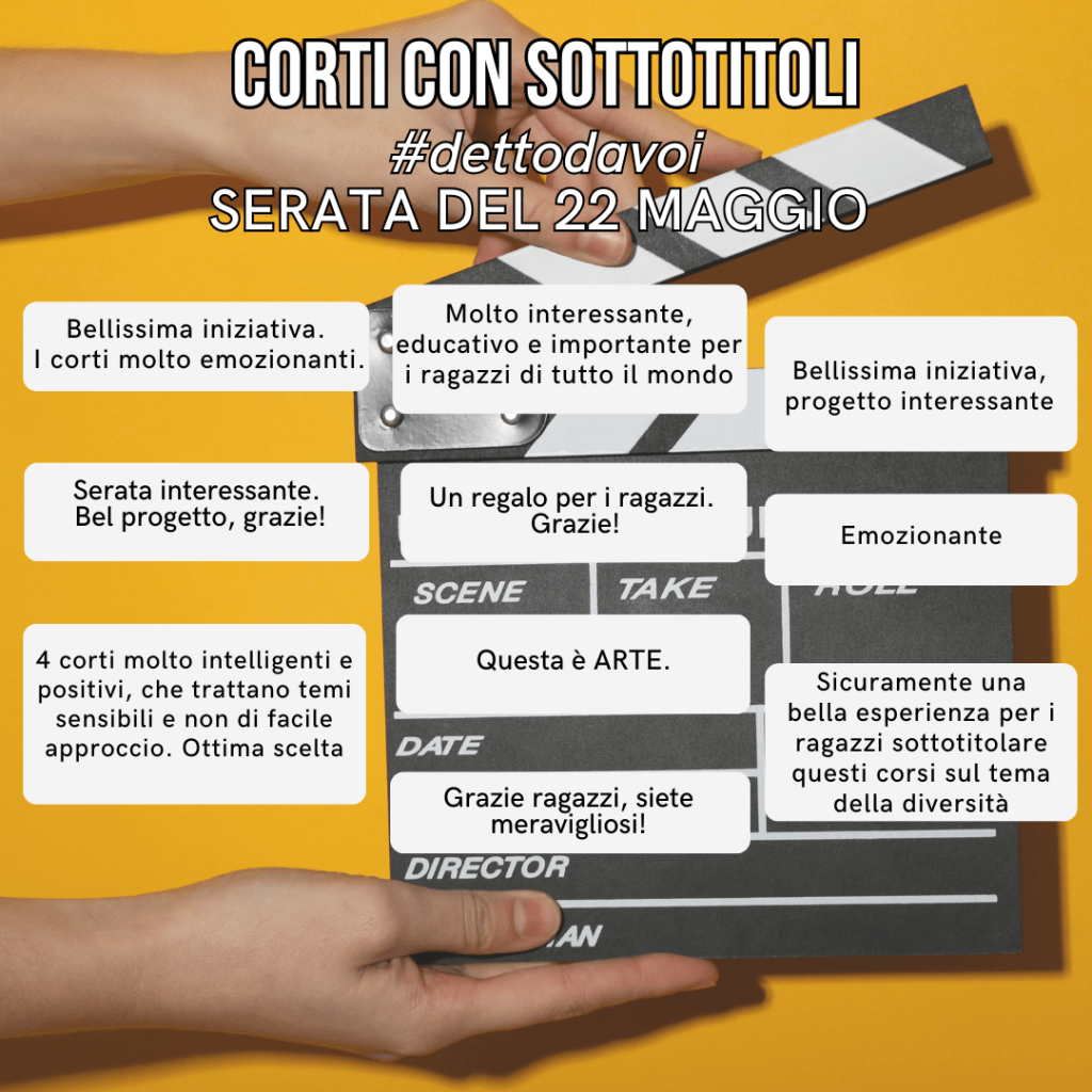 Dopo la serata del 21 maggio, dedicata ai corti con le audiodescrizioni, il 22 maggio sono stati protagonisti gli studenti delle terze medie, con quattro cortometraggi di cui hanno realizzato i sottotitoli, grazie al laboratorio condotto dall’esperta Laura Cini, la quale ha rivelato loro alcune delle tecniche, dei segreti e delle accortezze per scrivere sottotitoli efficaci.