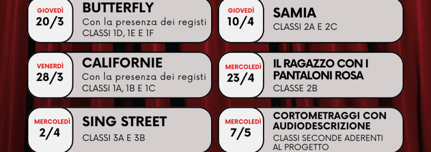 Con i film Butterfly e Californie dei due registi si darà il via alle proiezioni condotte dagli studenti, previste al cinema Teatro Everest a partire dal 20 marzo.